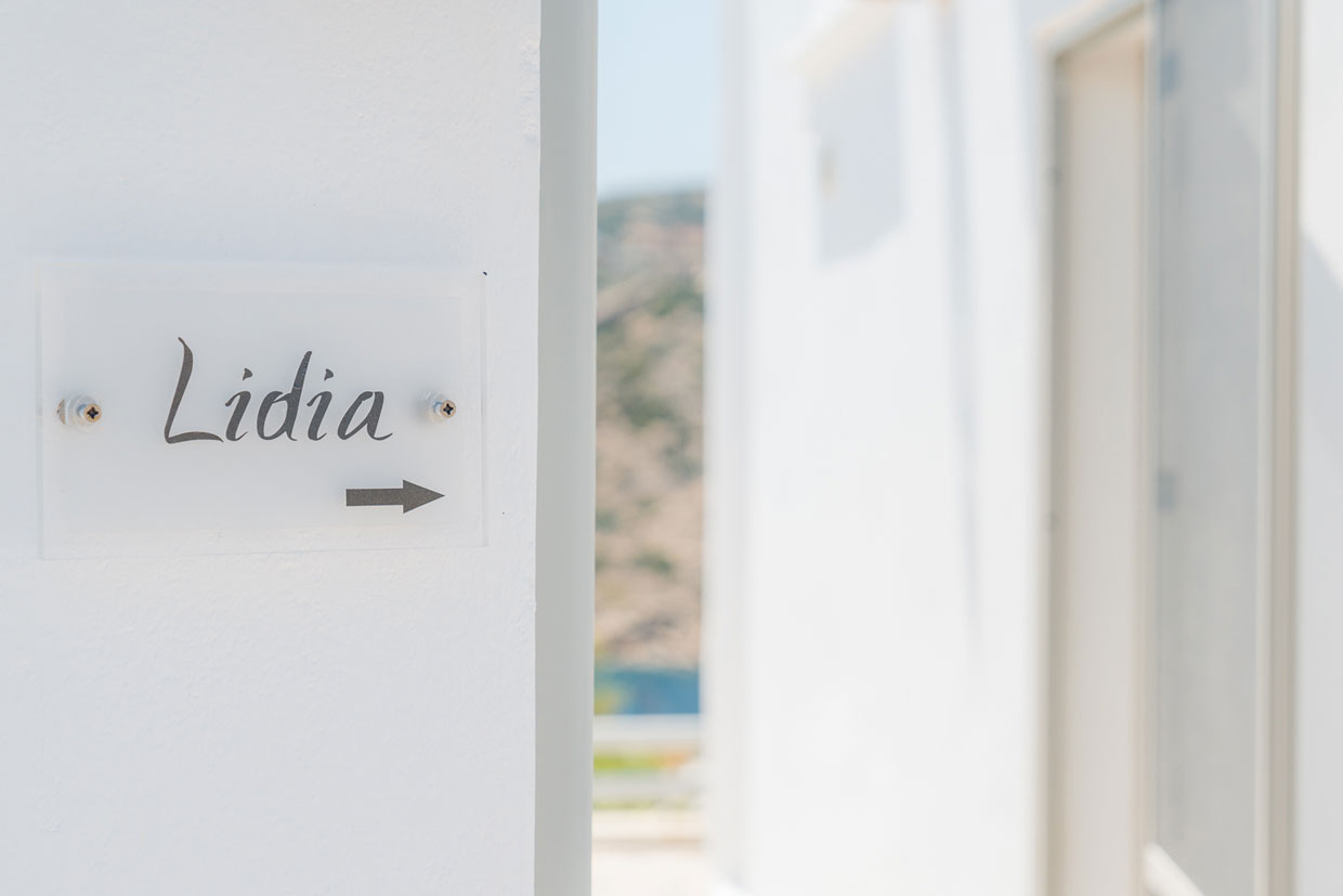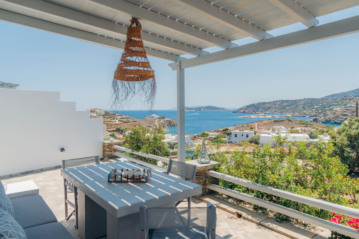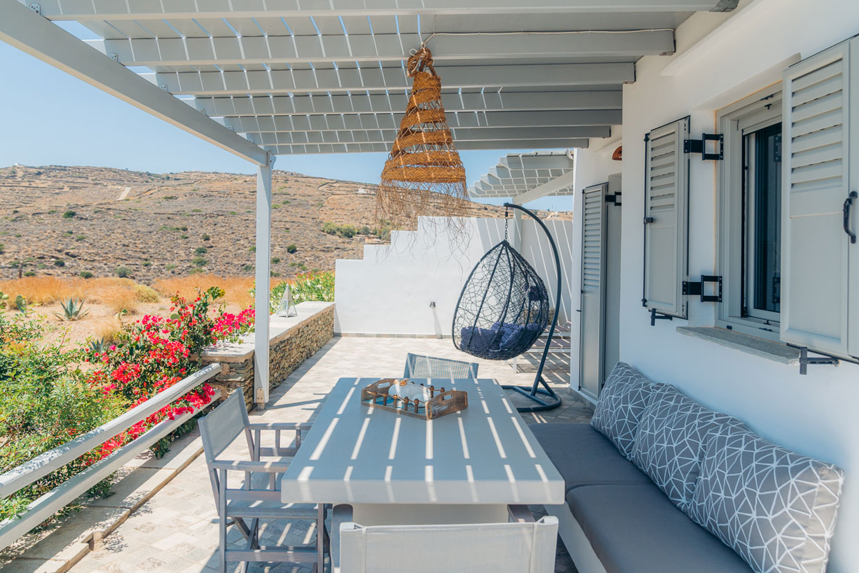 Στον εξωτερικό του χώρο κυριαρχεί η πλακόστρωτη σκιασμένη αυλή με θέα στον βράχο της Χρυσοπηγής και στη θάλασσα. Η βεράντα διαθέτει ξαπλώστρες, καθιστικό, τραπεζαρία ενώ πολύχρωμα λουλούδια και ιδιαίτερα διακοσμητικά στοιχεία συμπληρώνουν το σκηνικό.